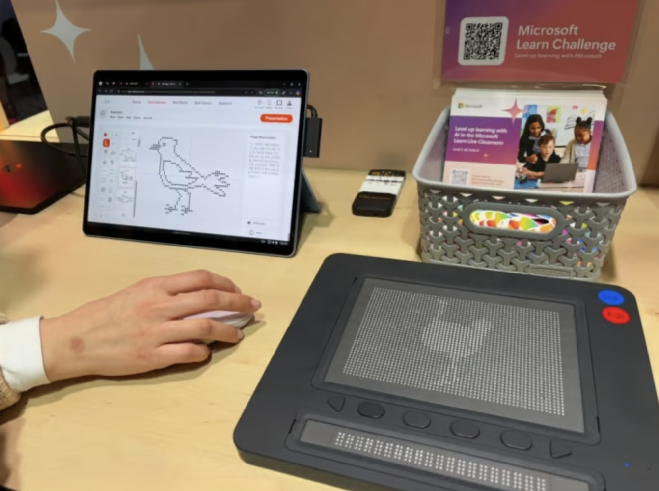 #컴퓨터에서 타조 사진을 누르자 300개 점자 셀(cell)에 그대로 모양이 나타난다. 시각 장애 학생들은 점자의 울퉁불퉁한 촉감을 따라가며 낯선 동물의 형태를 손끝으로 익힐 수 있다. 시각장애인용 점자패드를 최초로 개발한 한국 스타트업 닷(dot)은 마이크로소프트(MS) 파트너솔루션 업체로 선정돼 올해 벳쇼(Bett Show) 한복판의 초대형 부스에 등장했다. 닷이 개발한 패드는 다양한 이미지와 그래프 등을 인공지능(AI) 기반 촉각 점자 이미지로 변환해준다. 기존 한 페이지를 점자로 번역하려면 2시간이 걸렸지만, 이 기술을 통해 장애 학생과 점자로 실시간에 가까운 소통이 가능해졌다.